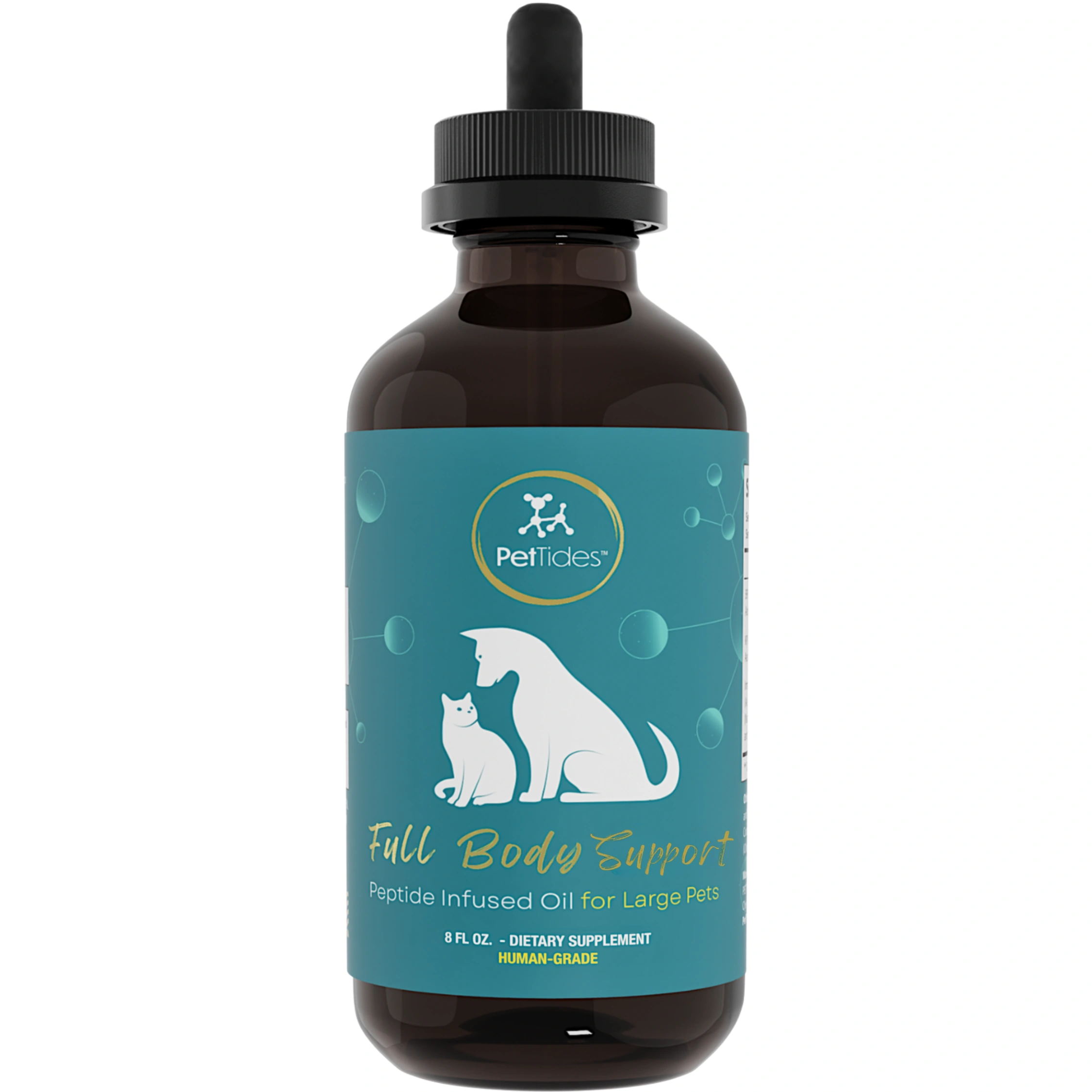 This oil is formulated with a precise blend of peptides in an 8oz bottle designed for large pets. It features Body Protection Compound-157, Immune Peptide A2, and KPV (Lysine-Proline-Valine), each included for its unique structure and molecular characteristics.