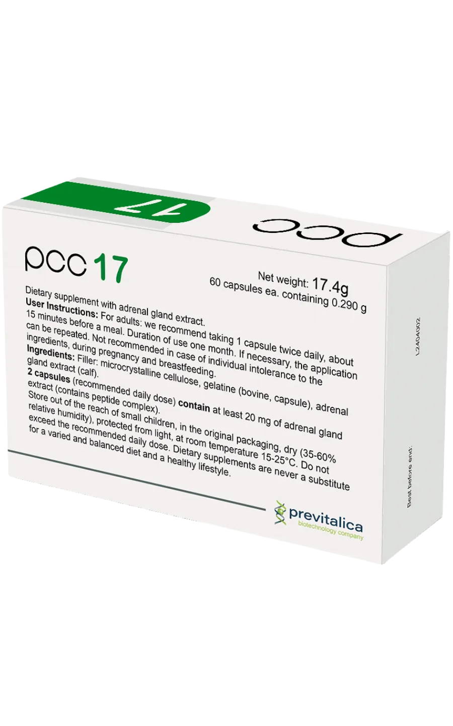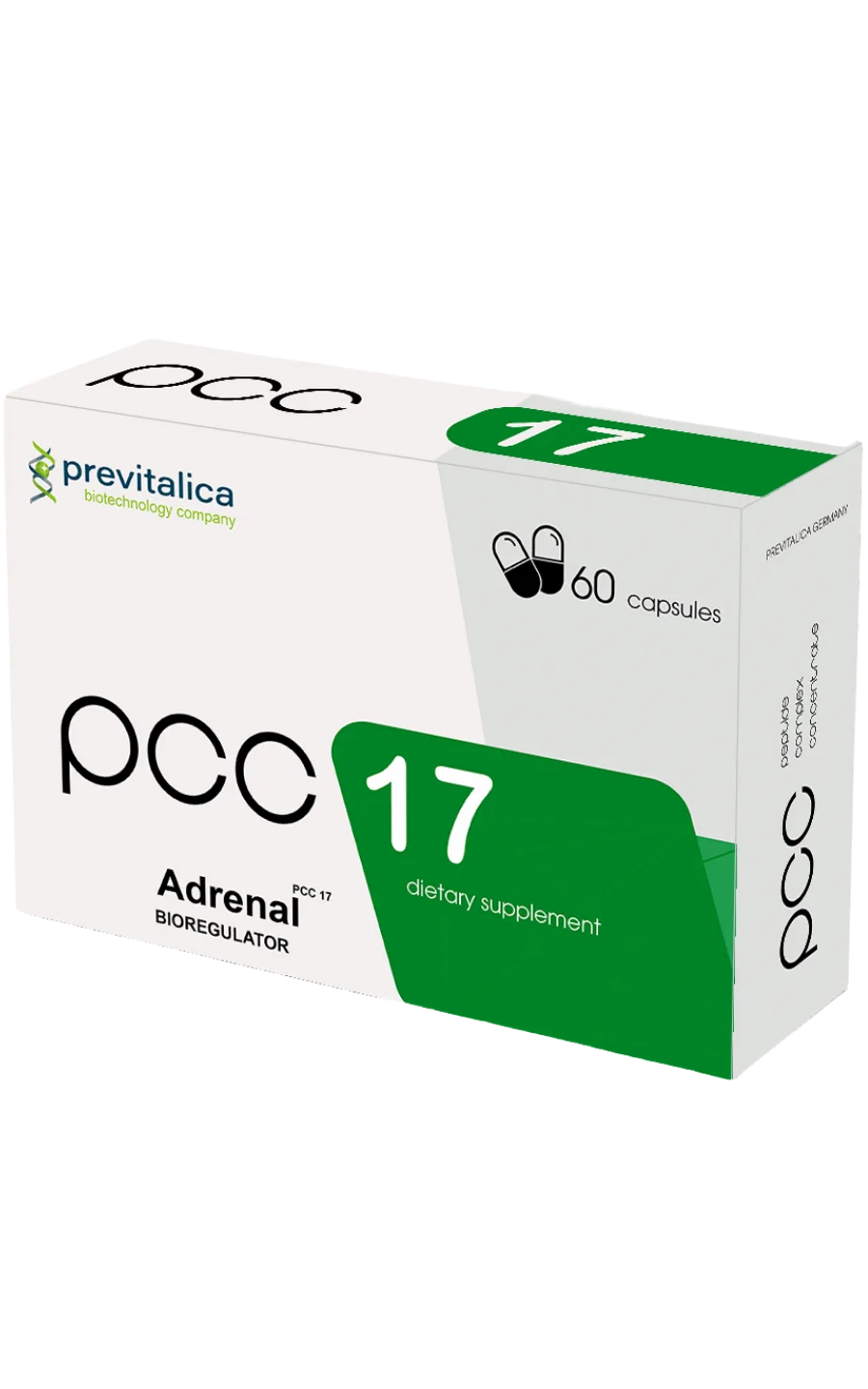 A dietary supplement formulated with adrenal gland extract ultrafiltrate, featuring a concentrated complex of naturally occurring peptides. 2 capsules PCC-17 (recommended daily dose) contain: adrenal gland extract ultrafiltrate (contains adrenal gland peptide complex concentrate)ย atย leastย 20ย mg.