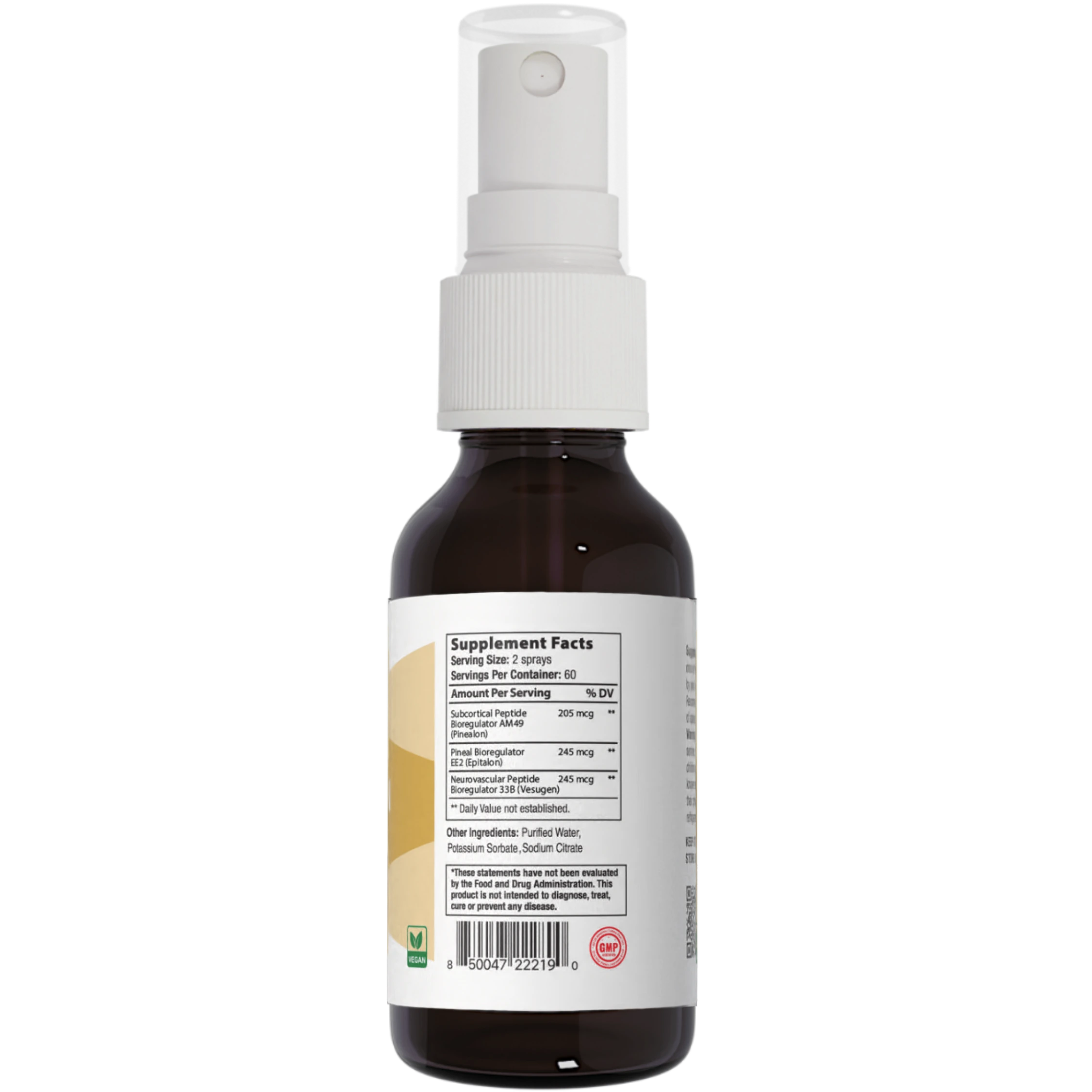 Epitalon Pinealon is a specialized micro-mist designed for rapid delivery and optimal bioavailability. This formula combines three synergistic peptide bioregulators—Epitalon, Pinealon, and Vesugen—in a convenient spray format that bypasses the digestive system for direct absorption. This blend is crafted to support pineal gland function, cognitive performance, and vascular integrity