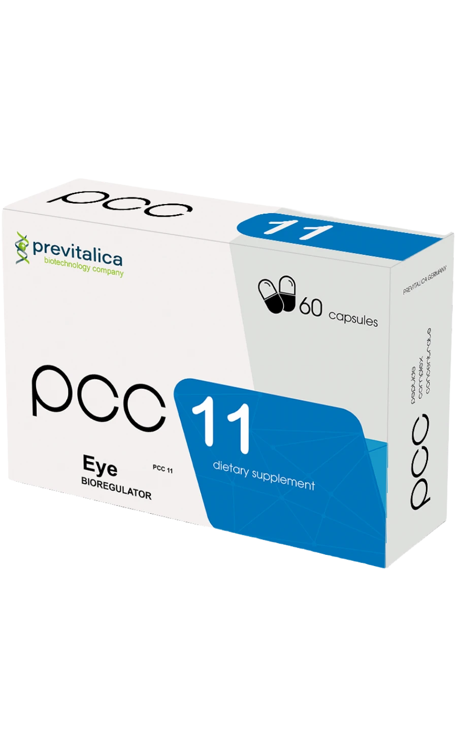 This peptide complex concentrate is derived from the eye tissues of young animals. The formulation contains no emulsifiers, stabilizers, carriers, preservatives, colorants, lactose, or other additives. 2 capsules PCC-11 (recommended daily dose) contain:ย eye extractย ultrafiltrate (containsย eye peptide complexย concentrate) at least 20 mg.