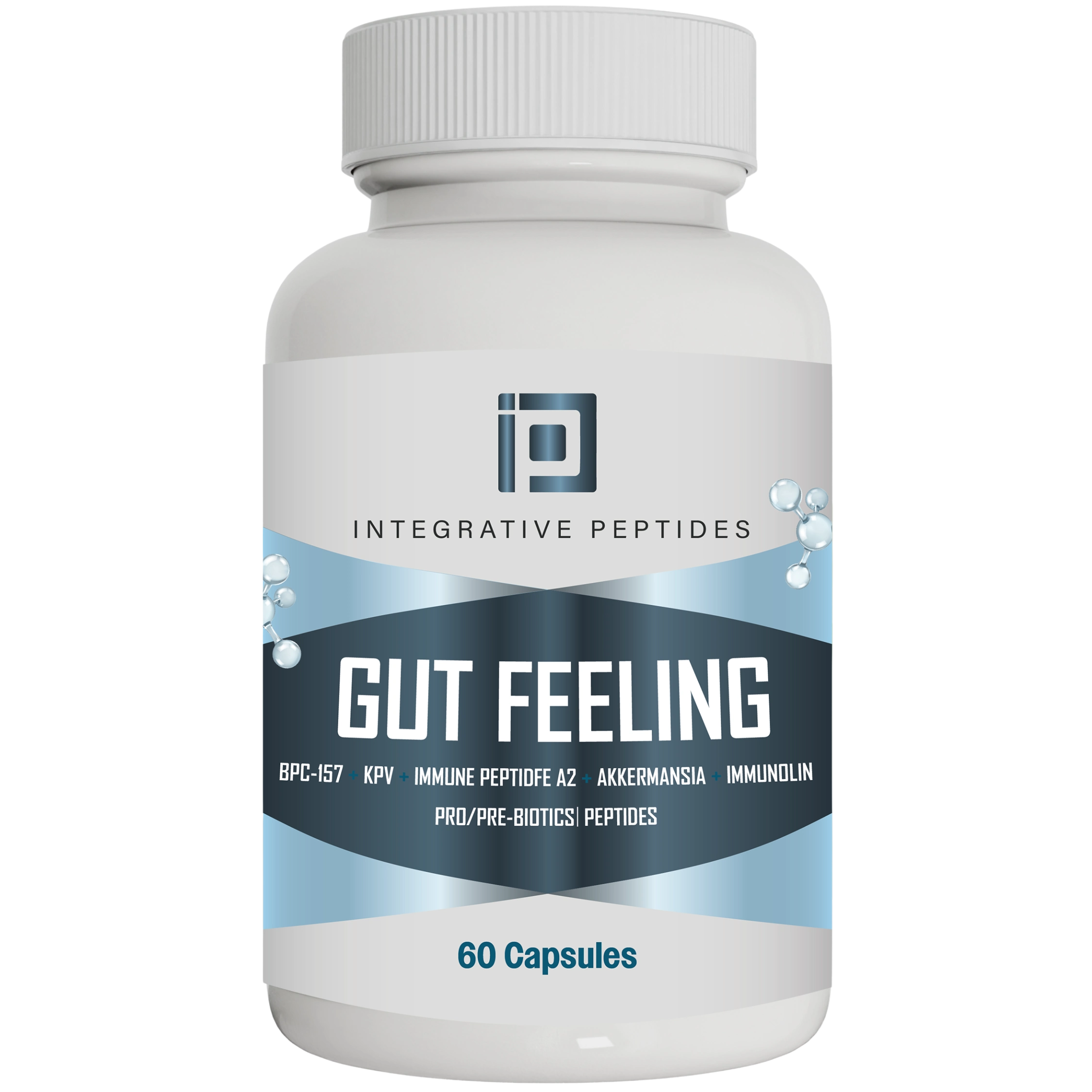 Gut Feeling Support Capsules is a dietary supplement formulated with a blend of naturally occurring peptides, probiotics, prebiotics, and supportive nutrients. Each capsule features BPC-157, KPV, Immune Peptide A2, potassium (as bicarbonate), spore-forming probiotics, Akkermansia, and bovine serumโderived immunoglobulins, combined with a gentle prebiotic base.