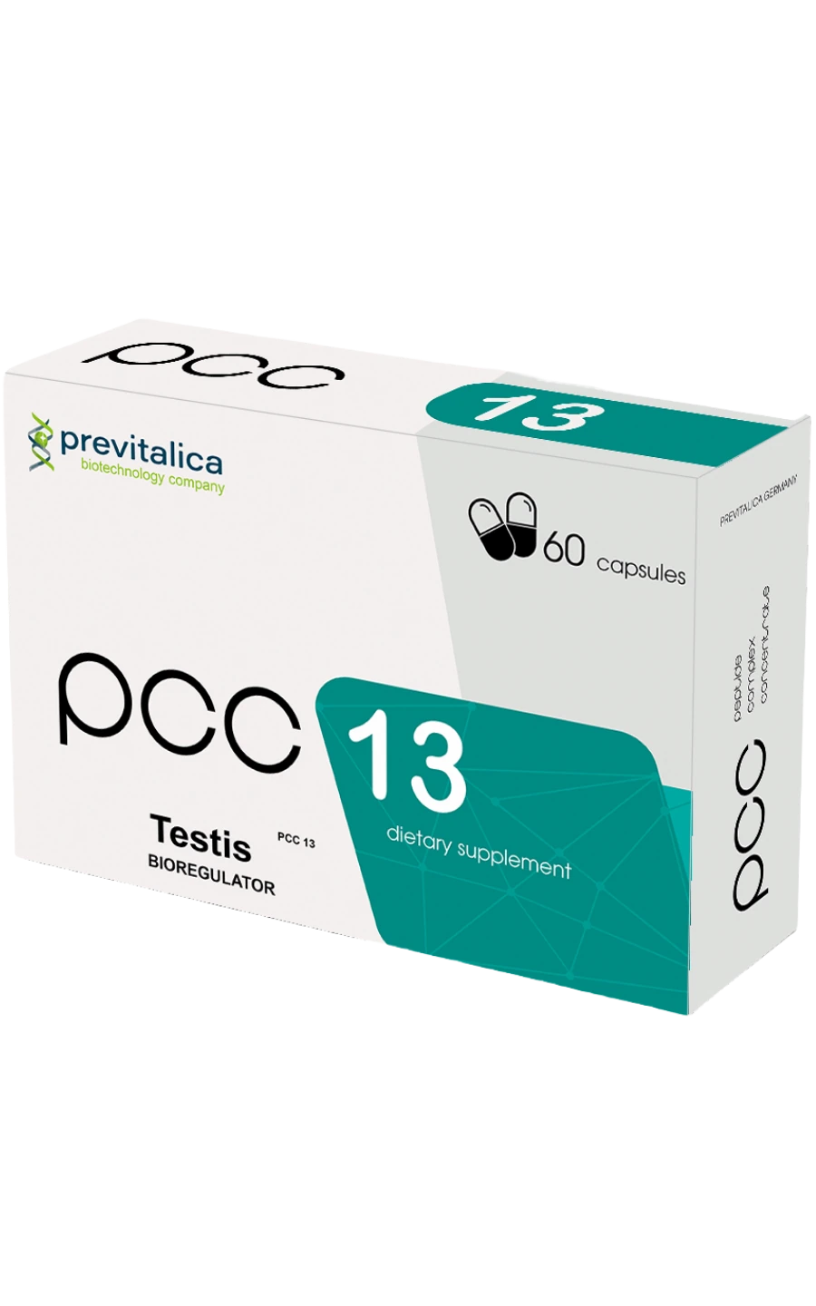 PCC-13 is a dietary supplement that contains ultrafiltrated extract from testicle tissue, which includes a testicle peptide complex concentrate. This formulation is part of a peptide-based product line developed with tissue-targeted considerations. 2 capsules PCC-13 (recommended daily dose) contain:ย testicle extractย ultrafiltrate (containsย testicle peptide complex concentrate) at least 20 mg.