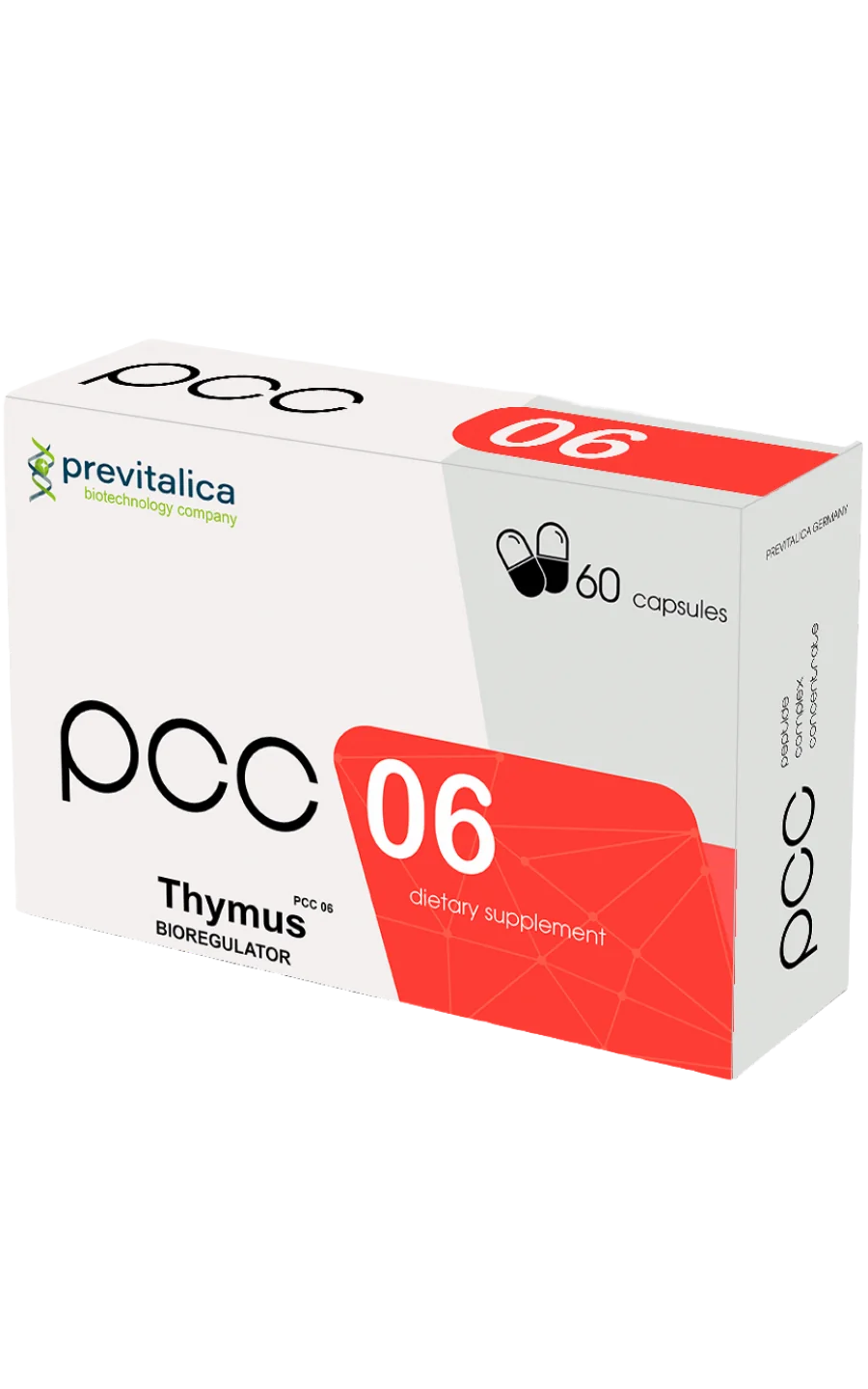 PCC-06 is a dietary supplement offered in capsule form. It contains a peptide complex derived from ultrafiltrated thymus extract and is part of a peptide-based product line. 2 capsules PCC-06 (recommended daily dose) contain: Thymus extract ultrafiltrate (contains adrenal gland peptide complex concentrate) at least 20 mg.